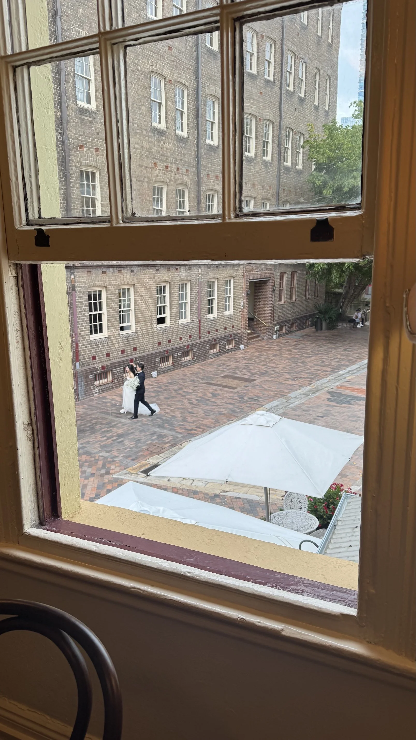Warm, nostalgic upstairs room overlooking The Rocks Markets.